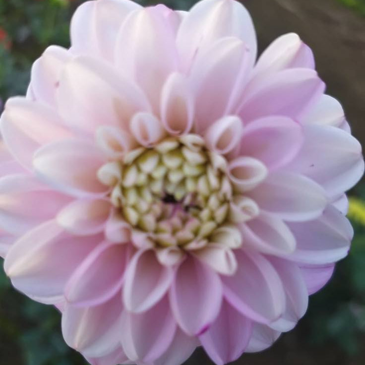 Hansford Combo is a small decorative dahlia. It features blush pink petals that gradually fade to cream at the centre, adorned with pink tips.