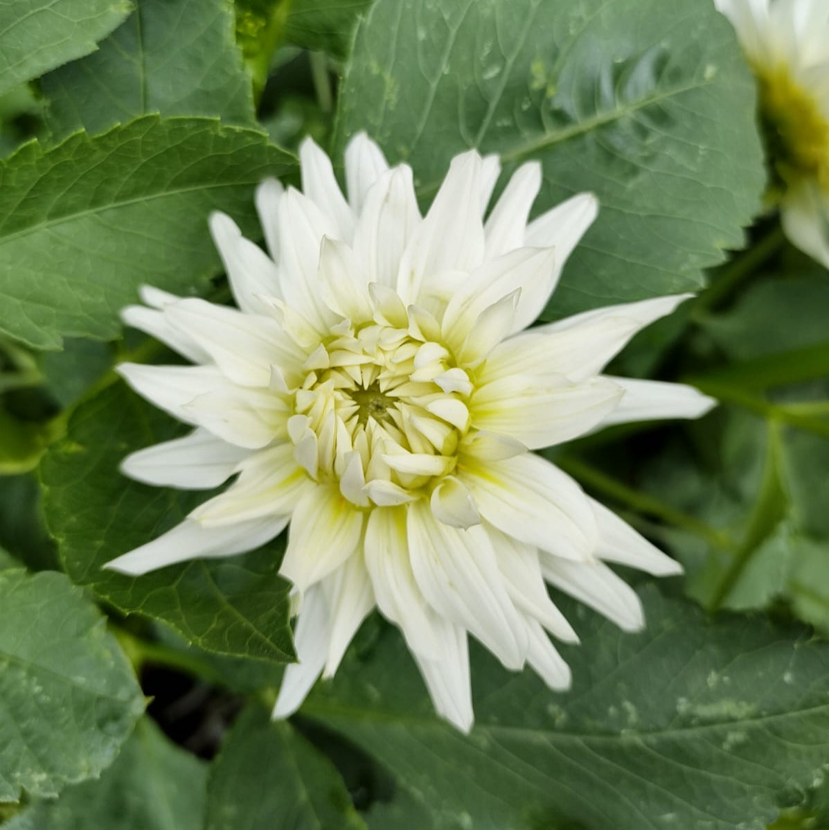 My Love is a semi-cactus dahlia featuring elegant, creamy white blooms with a subtle greenish-yellow centre. Its long, slender petals curl gracefully at the tips, creating a spiky yet refined appearance. Blooming from mid-summer until the first frost, it grows to approximately 1.2 to 1.5 metres tall.